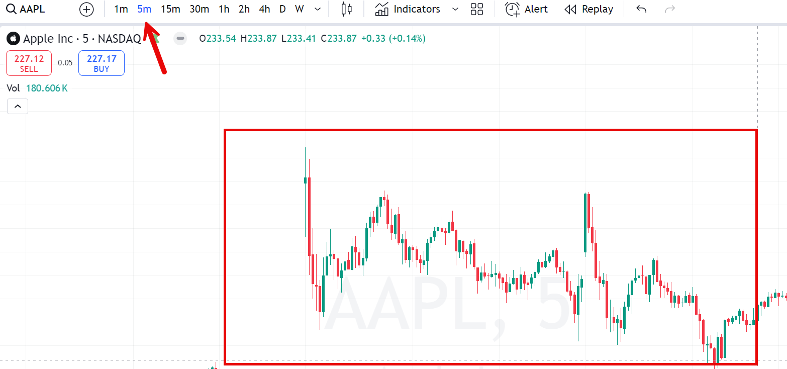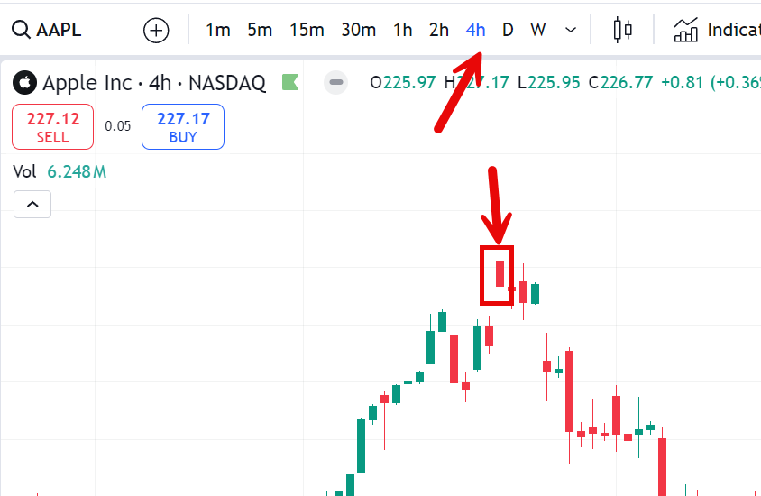 On peut analyser les chandelles sur différents axes de temps, ce qui permettra d’avoir plus de détail sur la variation du prix à l’intérieur d’une période. En changeant d’une intervalle de 4h vers une intervalle de 1h, chaque chandelle de 4H sera représentée par 4 chandelles de 1h, permettant de voir l’évolution heure par heure. En passant de 4h à 5 minutes, chaque barre de 4H sera représenté par 48 barres de 5 minutes.
